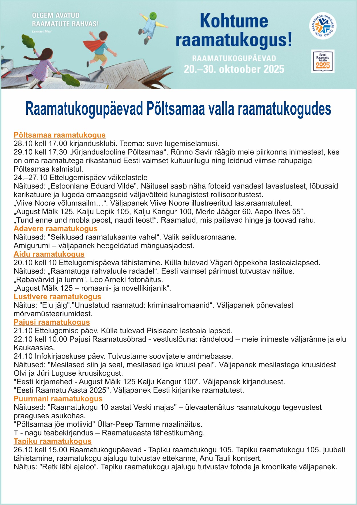 poltsamaa@poltsamaark.ee (info) viivika.lepp@poltsamaark.ee (direktor) Loreida.Kuppas@poltsamaark.ee (peaspetsialist) Riina.Holtsmeier@poltsamaark.ee (teenindusjuht) laenutus@poltsamaark.ee (täiskasvanute osakond, laenutustähtaja pikendamine) Viivi.Tell@poltsamaark.ee (laste- ja noorteosakond) Maris.Oro@poltsamaark.ee (kogude arenduse osakond) |