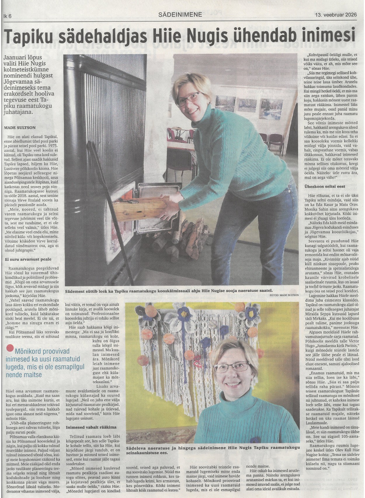 Tapiku sädehaldjas Hiie Nugis ühendab inimesi Made Sultson, Vooremaa 13.02.2026 nr 12, lk 6