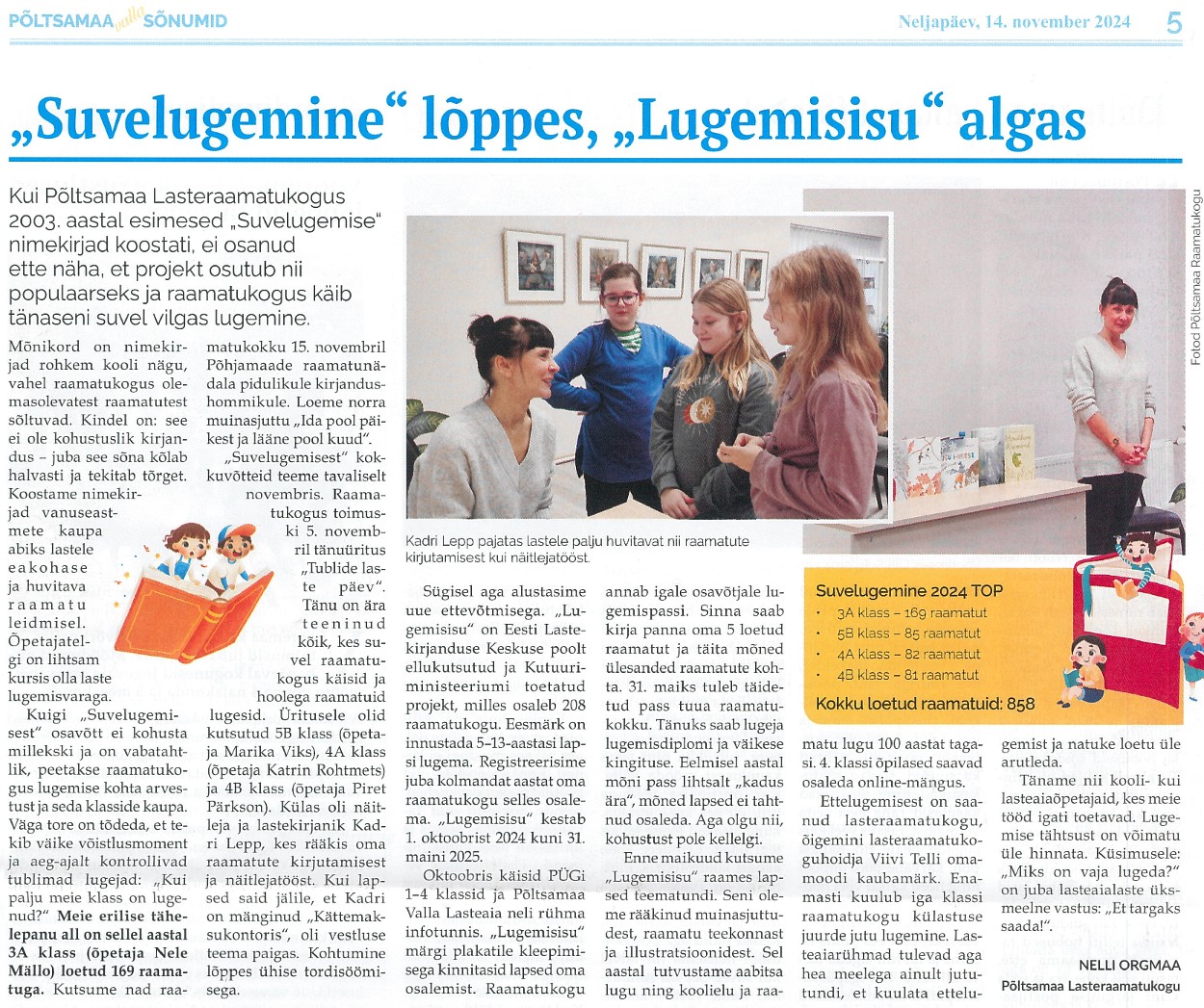 "Suvelugemine" lõppes, "Lugemisisu" algas Nelli Orgmaa, Põltsamaa Valla Sõnumid 14.11.2024 nr 217 lk 5