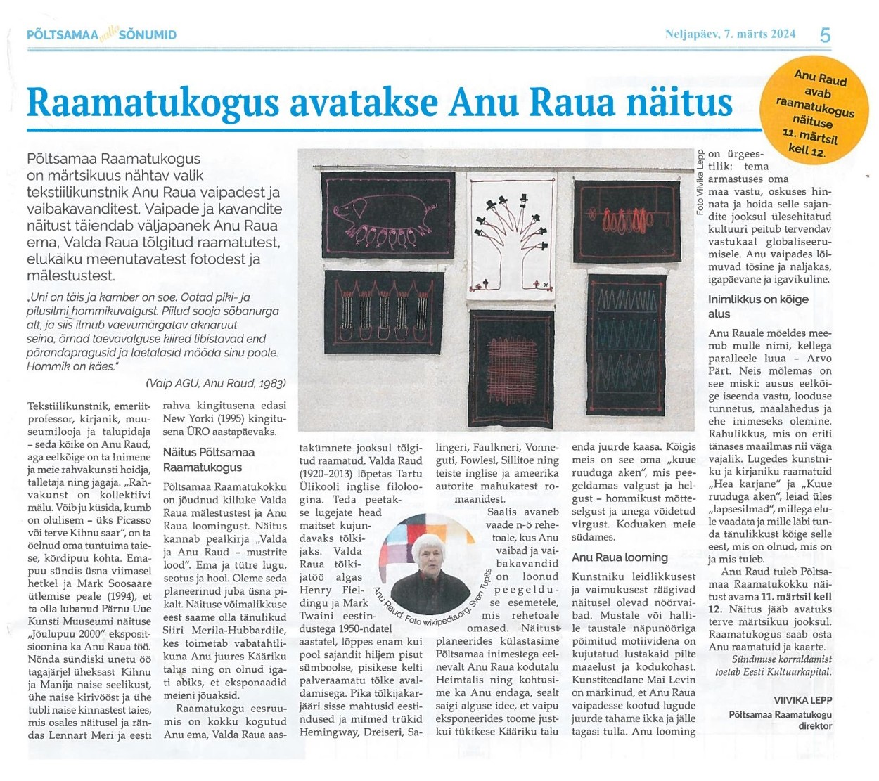 Raamatukogus avatakse Anu Raua näitus Viivika Lepp, Põltsamaa Valla Sõnumid 07.03.2024 nr 182, lk 5