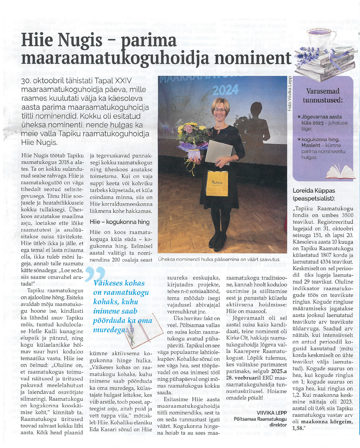 Hiie Nugis - parima maaraamatukoguhoidja nominent Viivika Lepp, Loreida Küppas, Põltsamaa Valla Sõnumid 7.11.2024 nr 216 lk 1