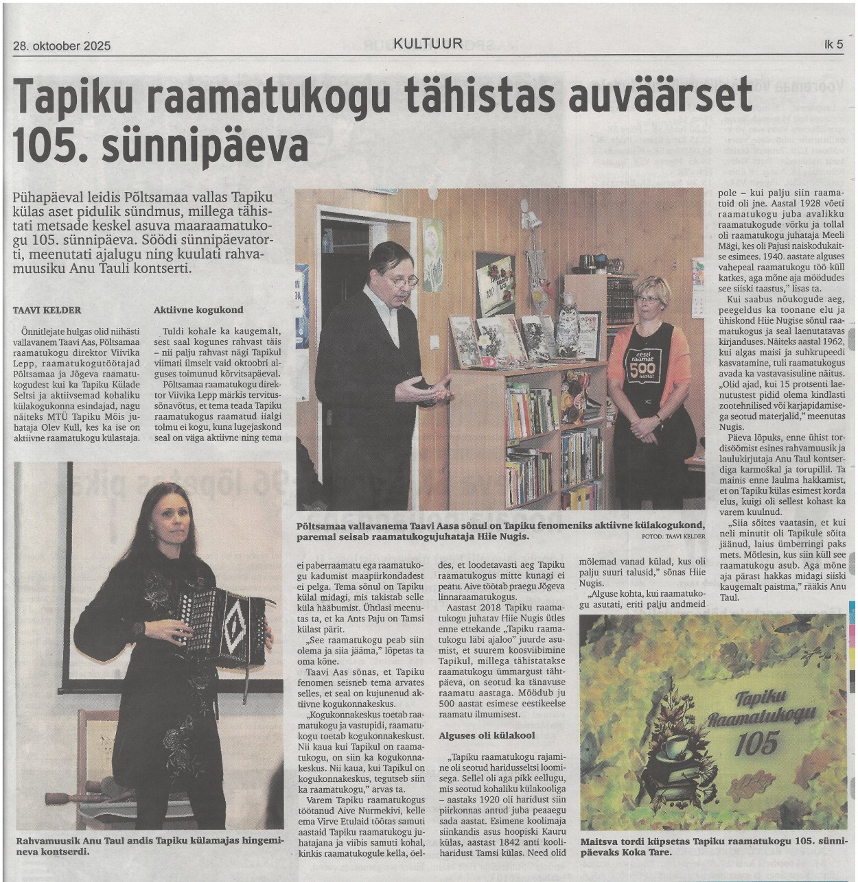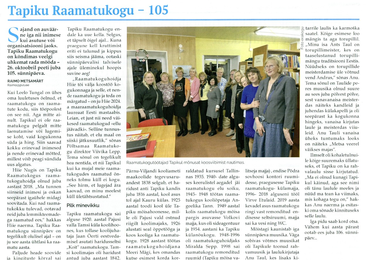 Tapiku raamatukogu tähistas auväärset 105. sünnipäeva Taavi Kelder, Vooremaa 28.10.2025 nr 81, lk 5
