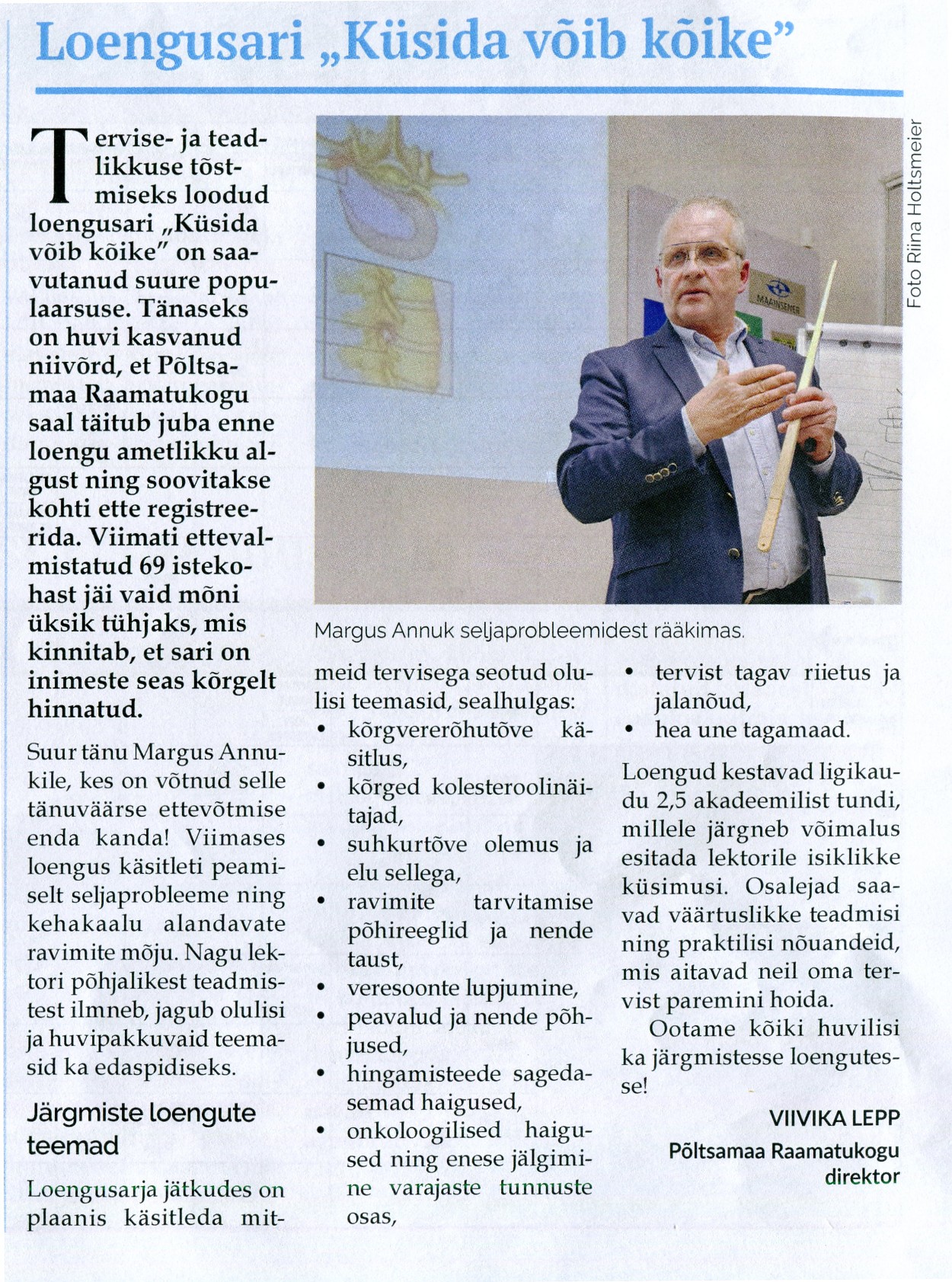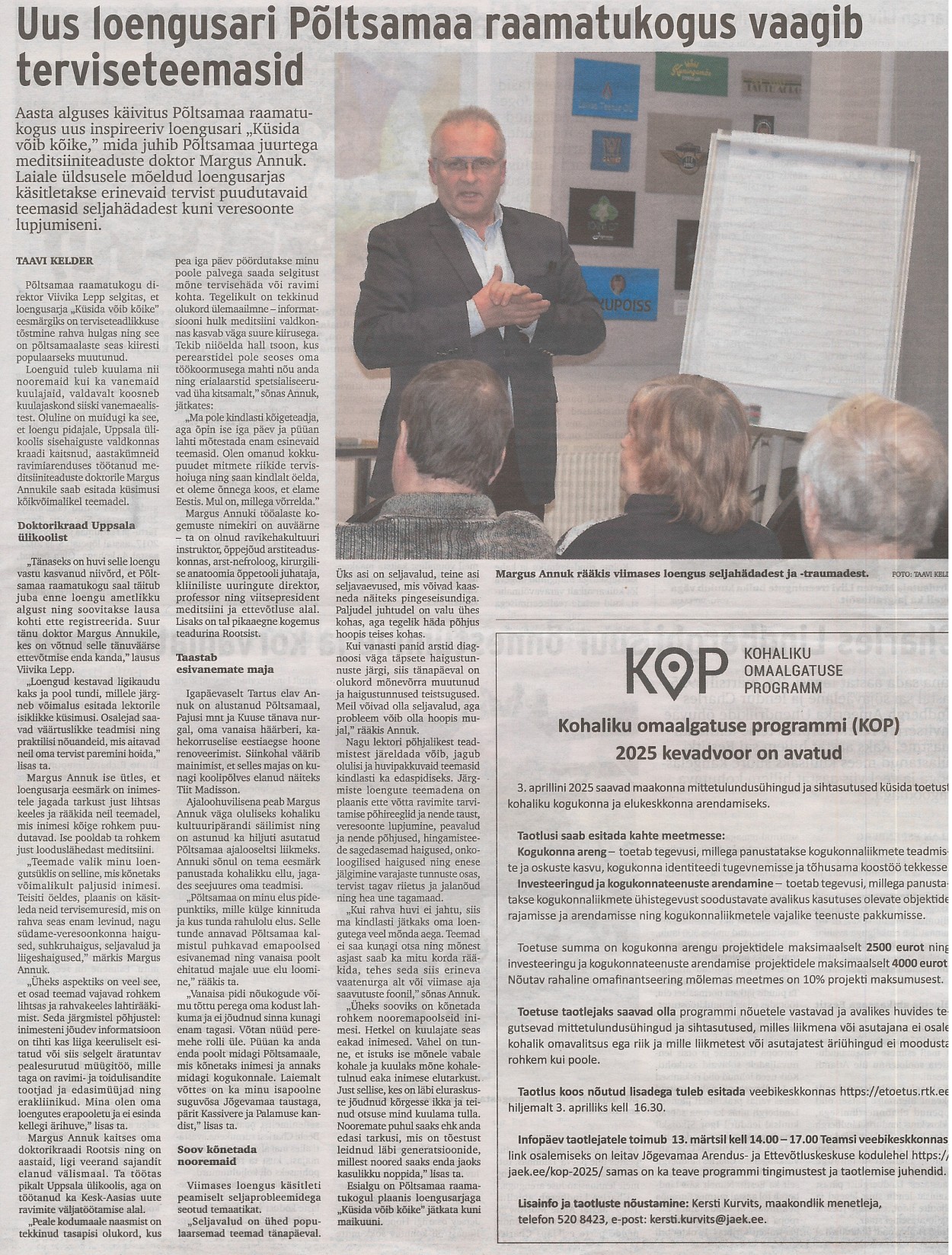 Uus loengusari Põltsamaa raamatukogus vaagib terviseteemasid Taavi Kelder, Vooremaa 07.03.2025, nr 18, lk 7