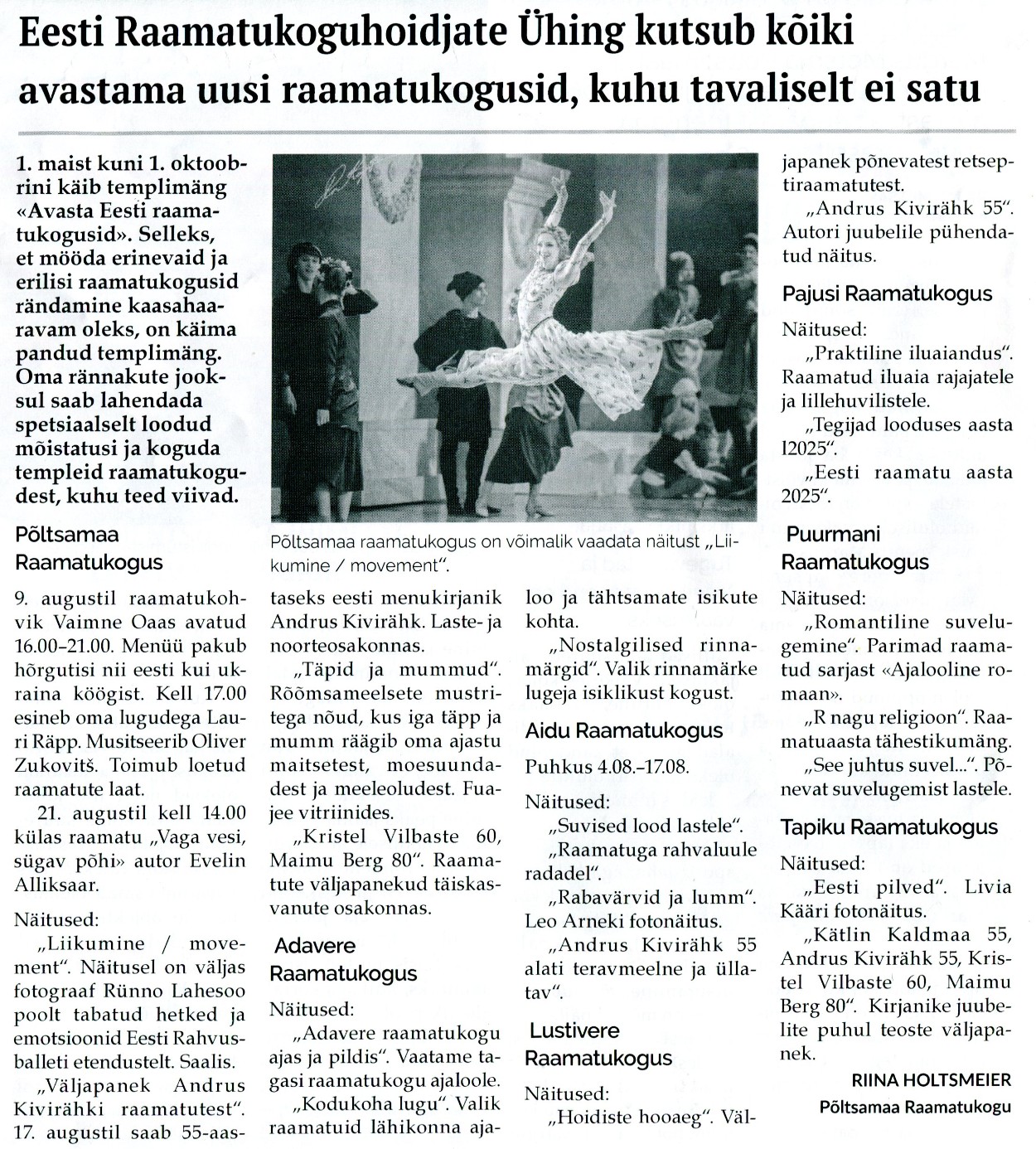 Eesti raamatukoguhoidjate Ühing kutsub kõiki avastama uusi raamatukogudusid, kuhu tavaliselt ei satu Riina Holtsmeier, Põltsamaa Valla Sõnumid 14.08.2025, nr 252, lk 2