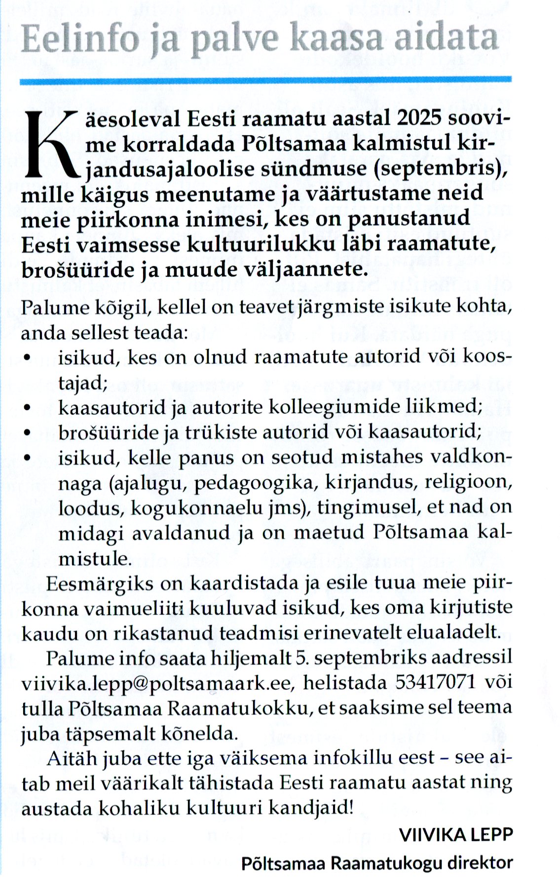 Eelinfo ja palve kaasa aidata Viivika Lepp, Põltsamaa Valla Sõnumid 14.08.2025 nr 252, lk 4