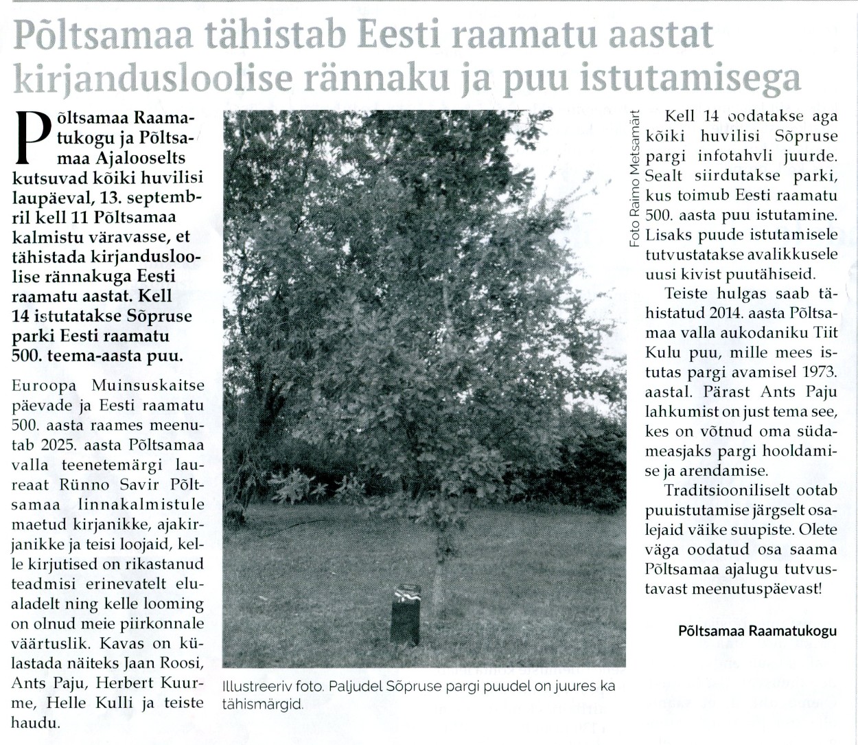 Põltsamaa tähistab Eesti raamatu aastat kirjandusloolise rännaku ja puu istutamisega Põltsamaa Valla Sõnumid 22.08.2025 nr 253, lk 3
