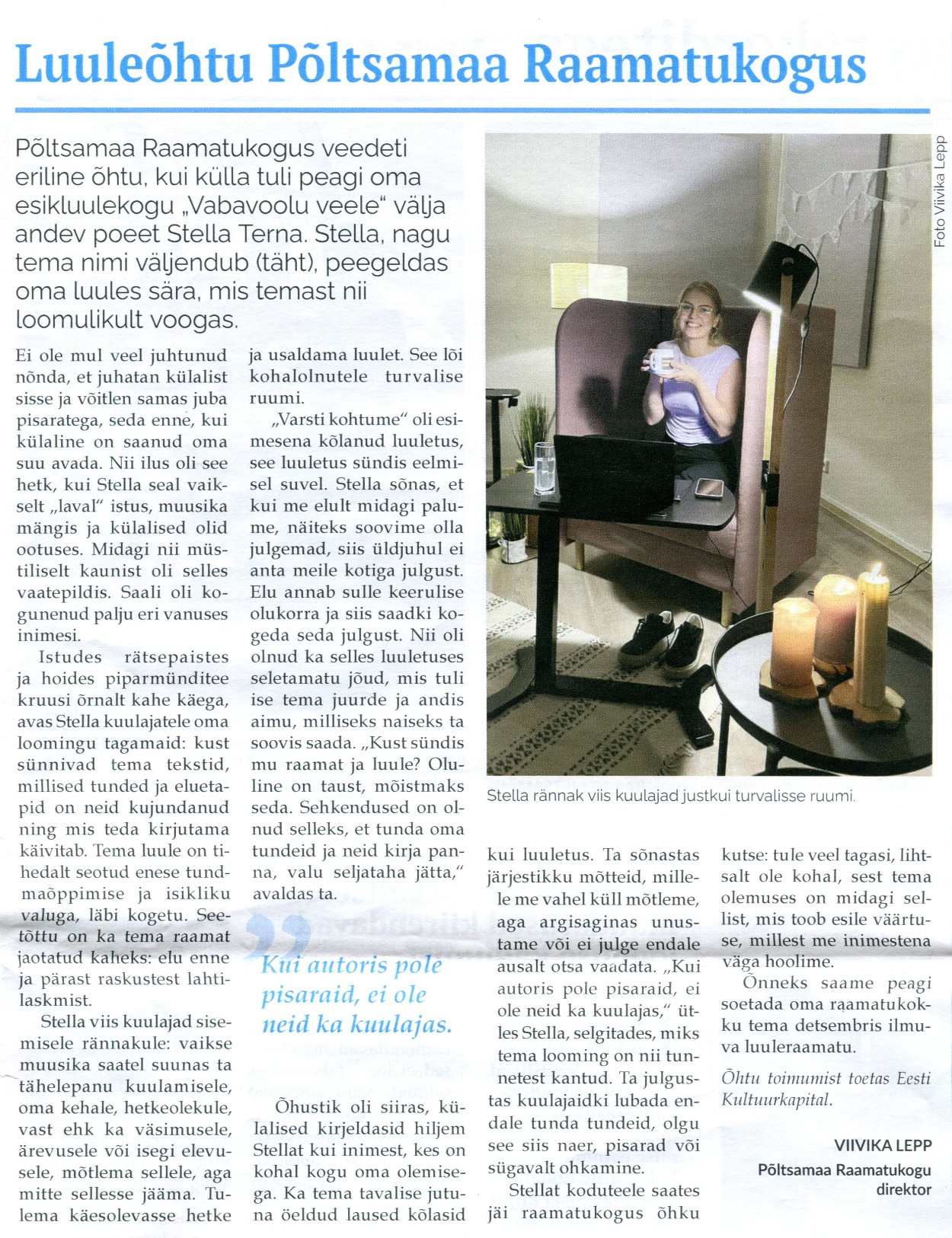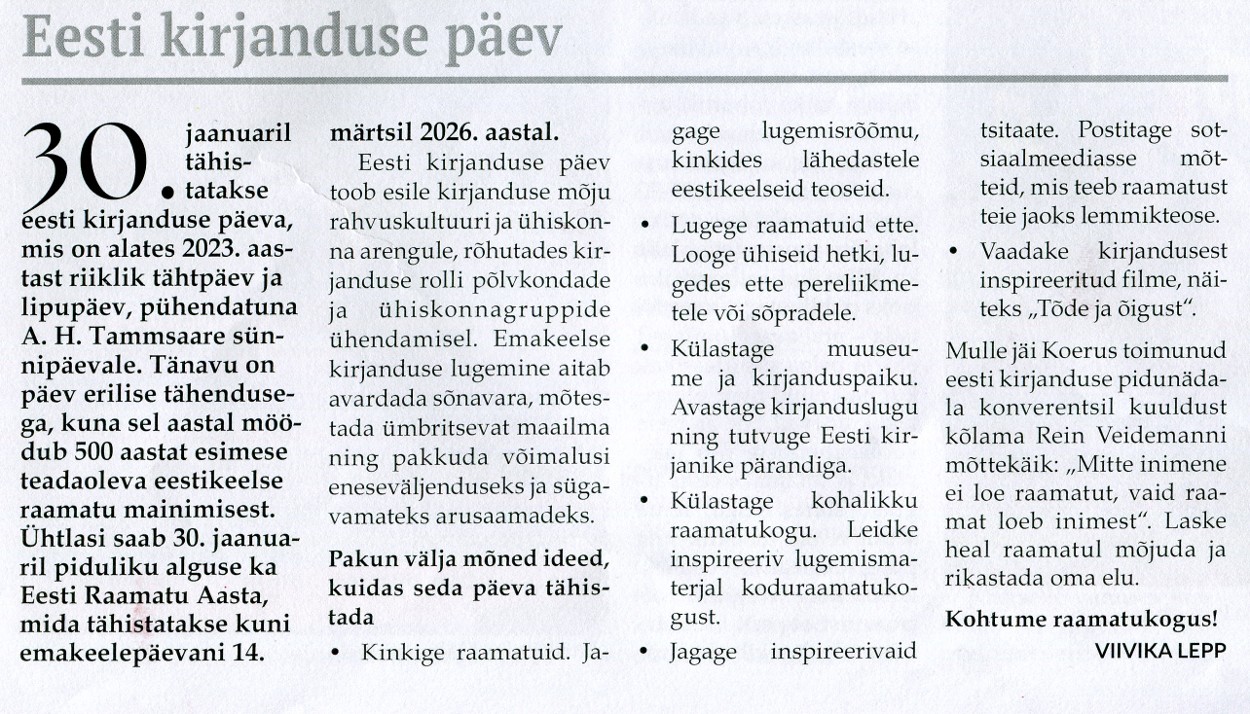 Eesti kirjanduse päev Viivika Lepp, Põltsamaa Valla Sõnumid 30.01. 2025, nr 226, lk 3
