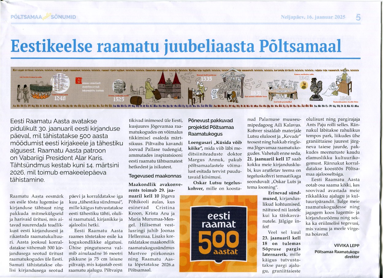 Eestikeelse raamatu juubeliaasta Põltsamaal Viivika Lepp, Põltsamaa Valla Sõnumid 16.01. 2025,nr 224, lk 5