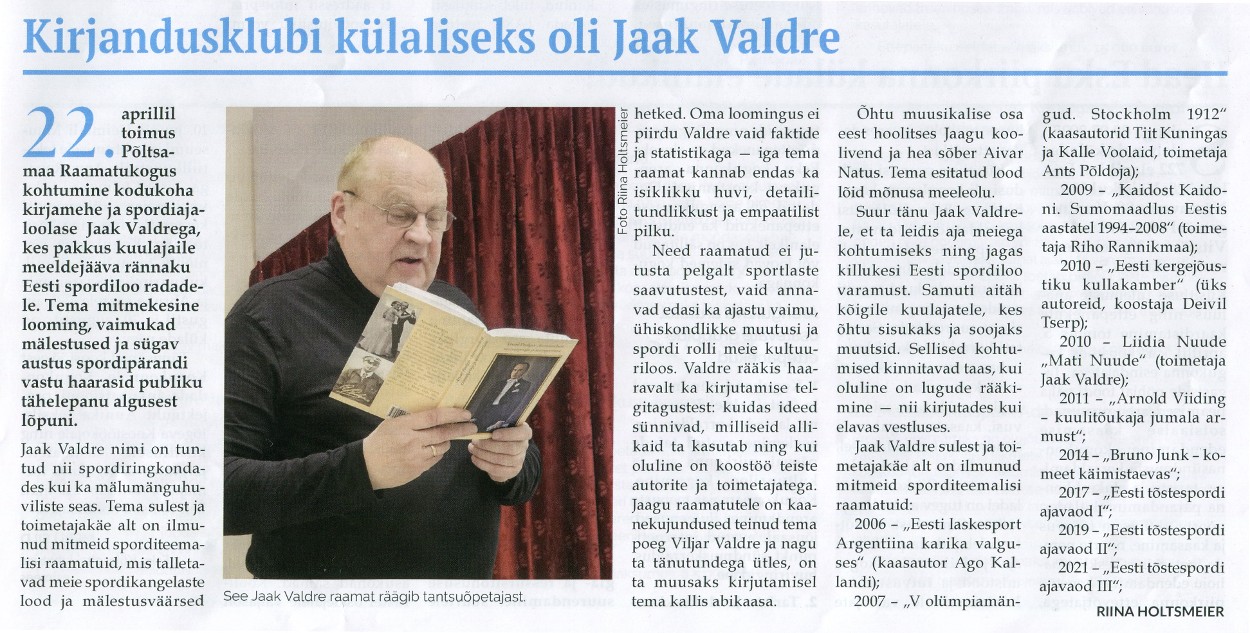 Kirjandusklubi külaliseks oli Jaak Valdre Riina Holtsmeier, Põltsamaa Valla Sõnumid 02.05.2025, nr 239, lk 5