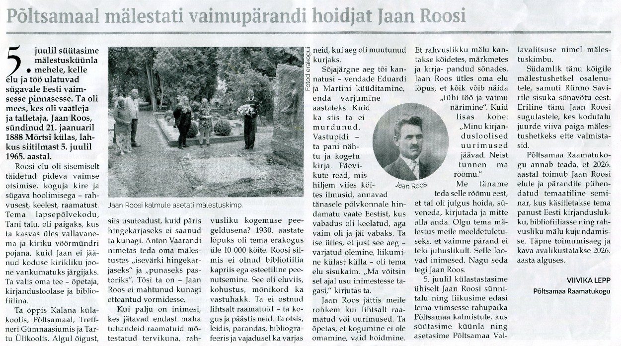 Põltsamaal mälestati vaimupärandi hoidjat Jaan Roosi Viivika Lepp, Põltsamaa Valla Sõnumid 10.07.2025 nr 248, lk 3